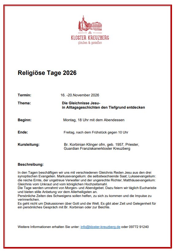 - Individueller Termin für Beichtgespräch mit P. Korbinian Tel: 09772 912414 und P. Othmar Tel: 09772912412 möglich.